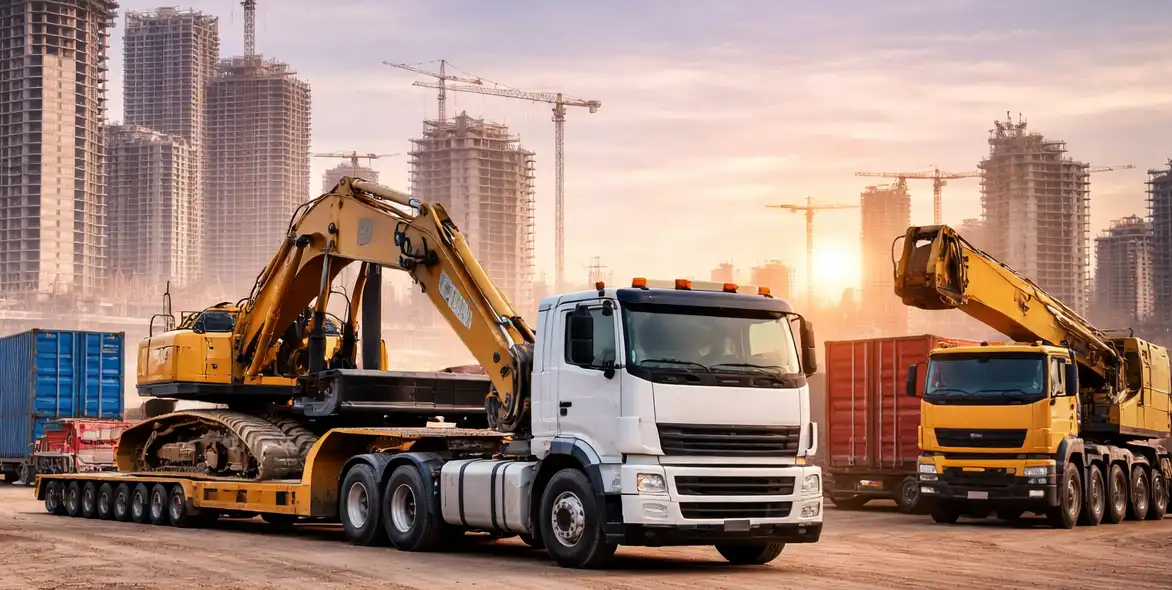 Flatbed trailers, lowboy carriers, and heavy haulage vehicles for transporting construction materials, industrial machinery, steel, precast elements, and oversized loads.
